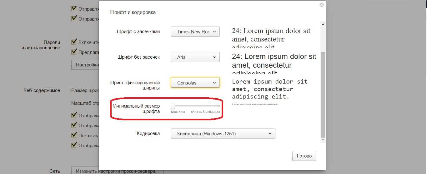 - Минимальный размер шрифта (Minimum size) в этом пункте можно увеличить текст в Яндексе написанный маленьким шрифтом установив с помощью ползунка каким он должен отображаться.