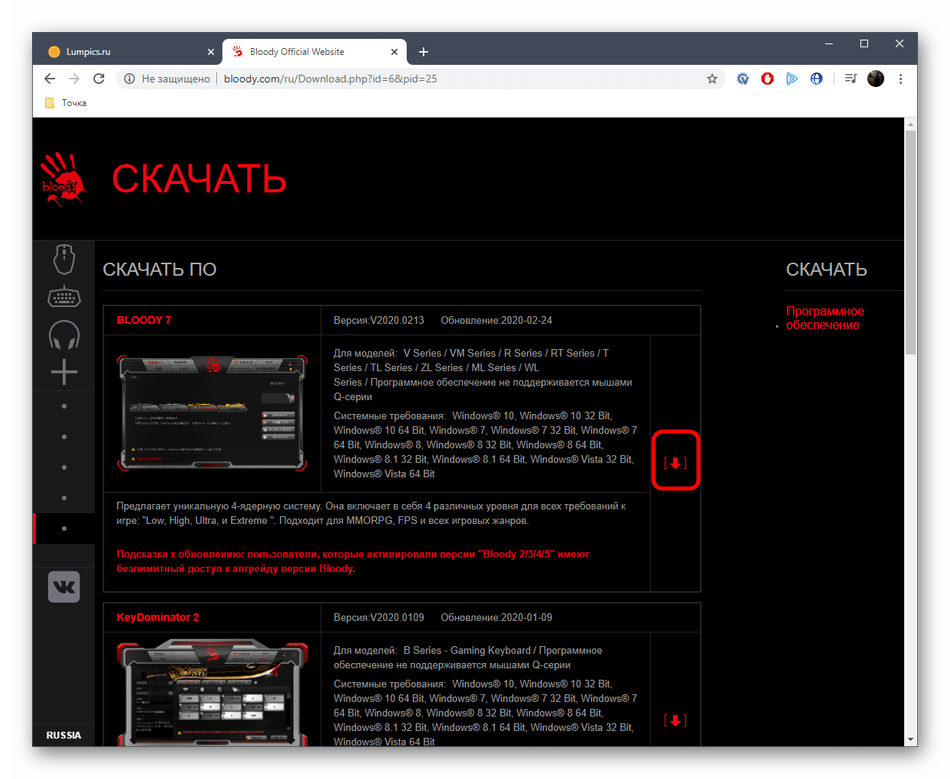 Установить программное обеспечение Bloody 7 возможно несколькими способами. Главный среди них – использование официального сайта. Зайдя на веб-сайт разработчика, пользователь найдет множество доступных ПО для разных целей. Среди них необходимо найти подходящую версию. Возле нее расположен значок загрузки.