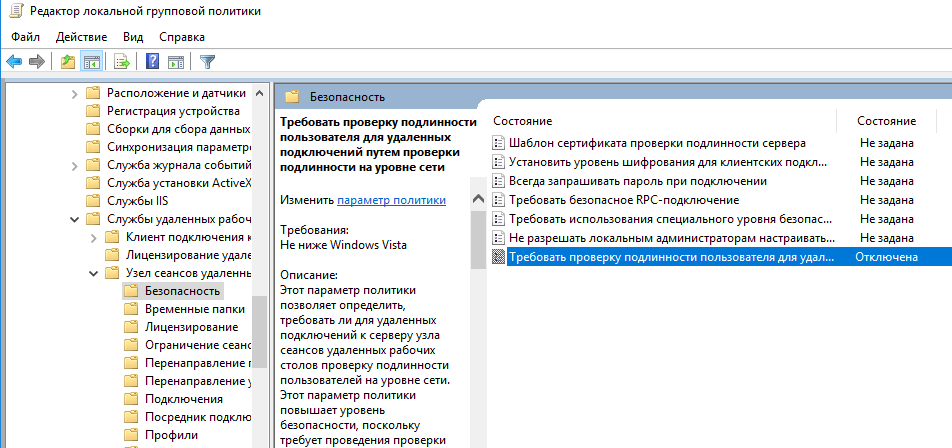 Также нужно в политике «Требовать использования специального уровня безопасности для удаленных подключений по протоколу RDP» (Require use of specific security layer for remote (RDP) connections) выбрать уровень безопасности (Security Layer) — RDP.
