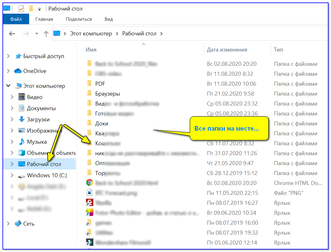 Как видите из моего примера ниже — на самом рабочем столе ничего не отображается, а вот в каталоге «Desktop» — все файлы и папки целы.