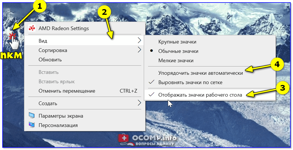 Чтобы исправить это, просто кликните правой кнопкой мышки в любом свободном месте рабочего стола, и в меню “Вид” поставьте галочку рядом с пунктом “Отображать значки рабочего стола”. Пример ниже.