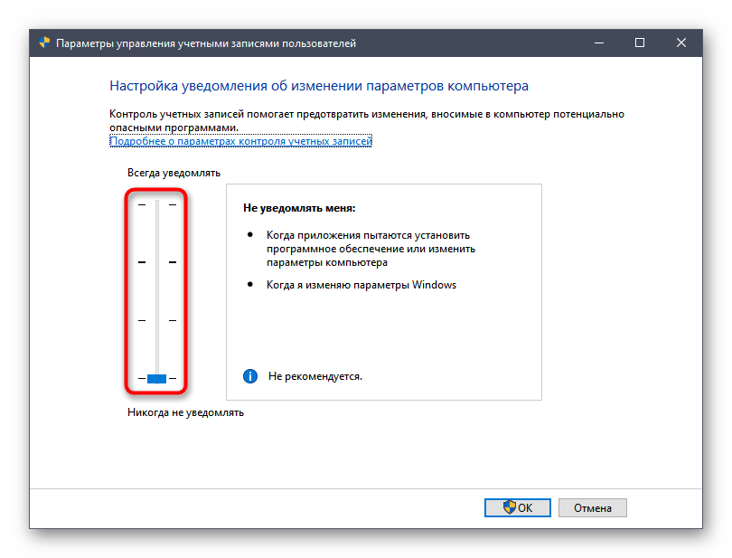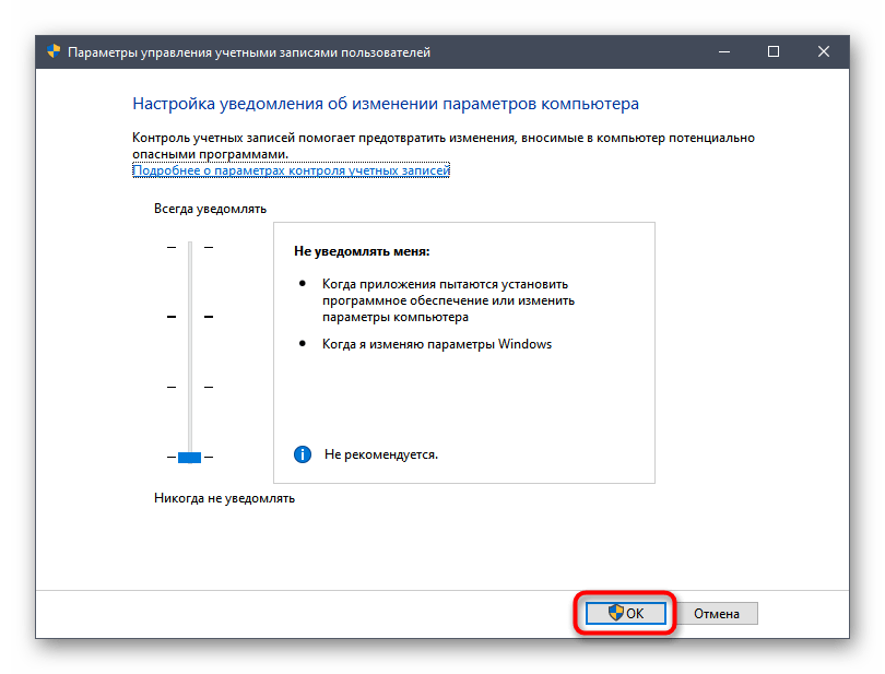 Этот метод крайне редко оказывается эффективным, однако его необходимо попробовать реализовать, если ничего из вышеперечисленного не помогло. Суть способа состоит в том, чтобы изменить параметры контроля учетных записей, разрешив тем самым установку приложений без отправки уведомлений администратору.