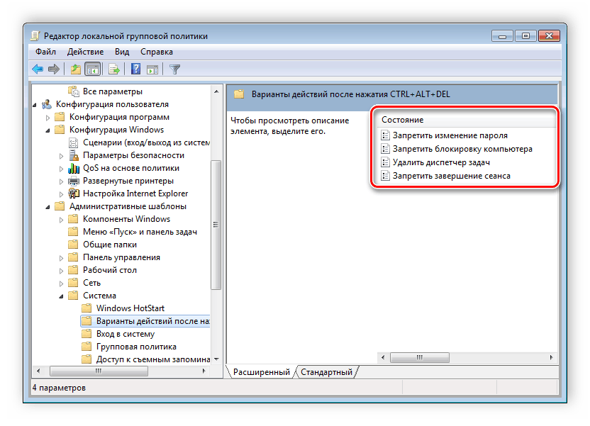 - Перейдите в папку «Конфигурация пользователя», «Административные шаблоны», «Система» и «Варианты действий после нажатия Ctrl + Alt + Delete».