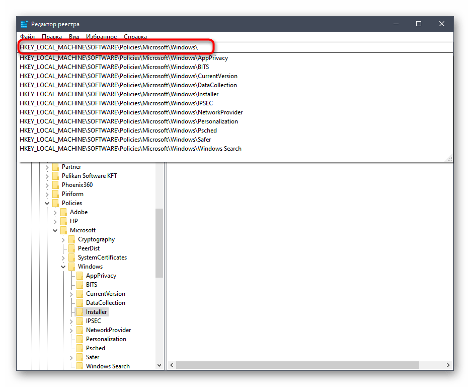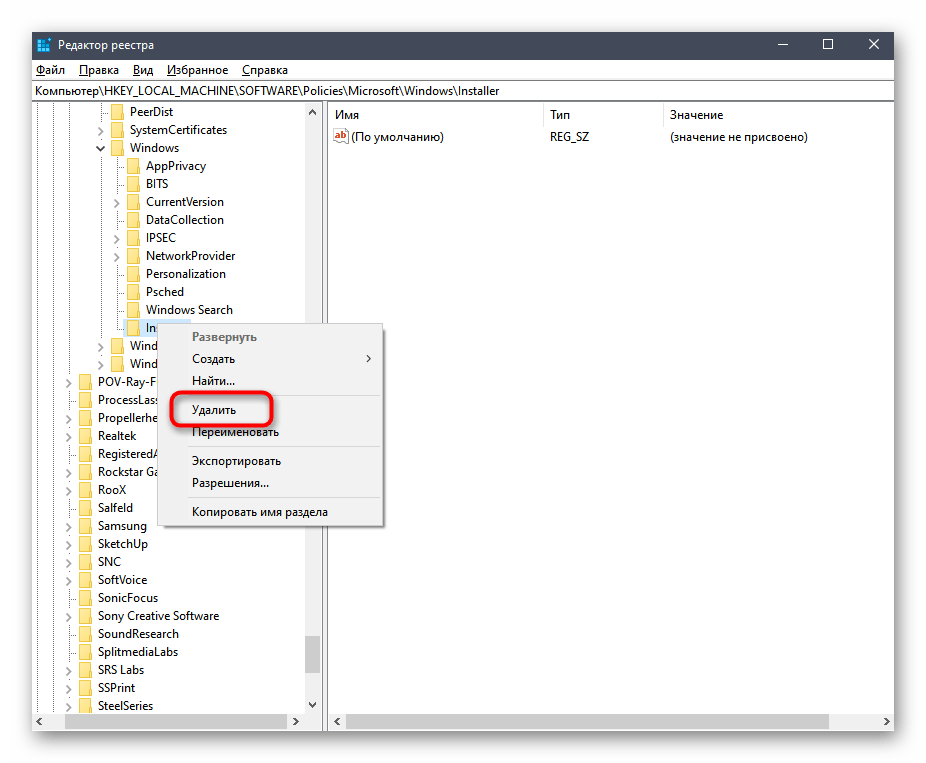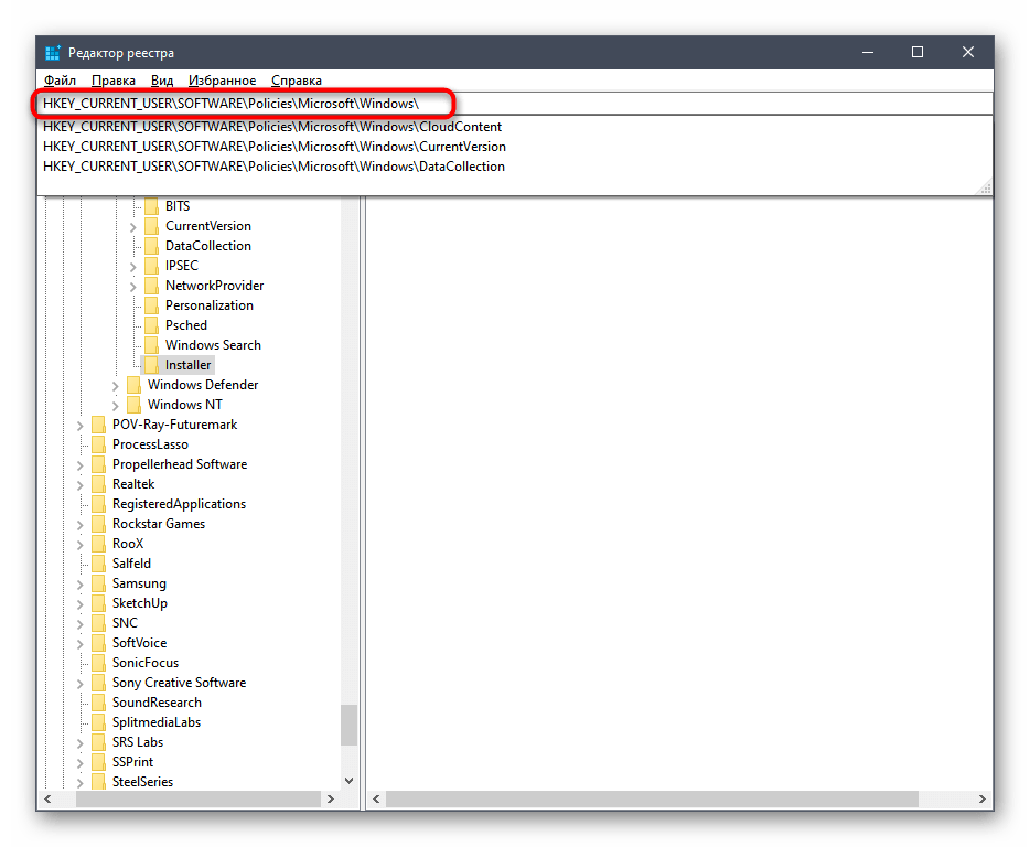 За действие политики может отвечать каталог с параметрами в реестре, провоцируя появление ошибки при инсталляции определенных программ. Лучший способ проверить это — найти каталог и, в случае его наличия, удалить.
