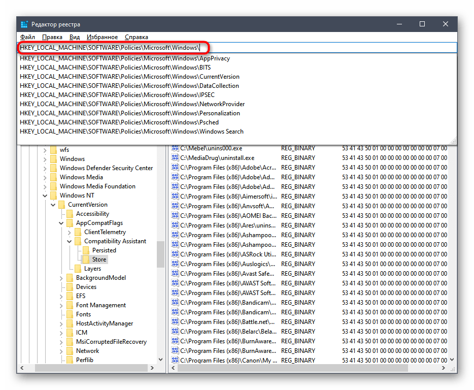 - Перейдите по первому пути HKEY_LOCAL_MACHINESOFTWAREPoliciesMicrosoftWindows , вставив этот адрес в адресную строку.