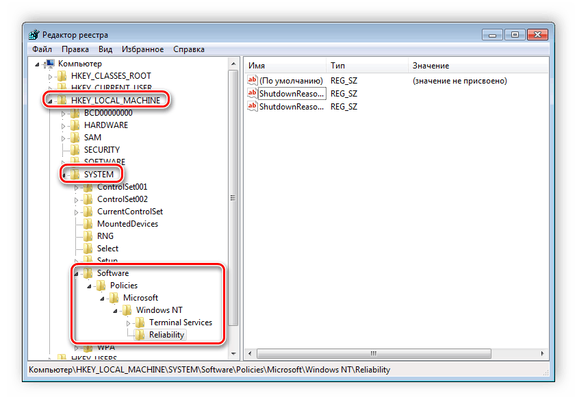- Найдите в разделе две строки: «ShutdownReasonOn» и «ShutdownReasonUI».