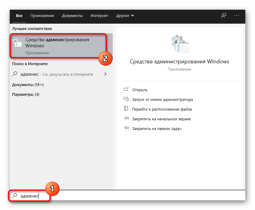 - В меню «Пуск» через поиск отыщите приложение «Средства администрирования Windows».