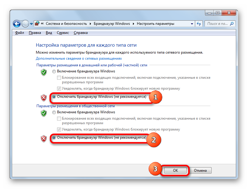 Также попробуйте отключить брандмауэр Windows. Для этого перейдите по пути «Пуск» — «Панель управления» — «Система и безопасность» — «Брандмауэр Windows» — «Включение или выключение брандмауэра Windows»: