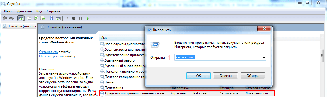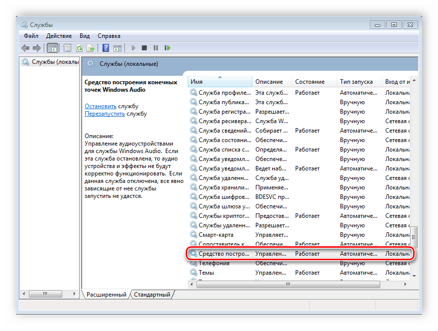Выберите службу «Средство построения конечных точек Windows Audio».