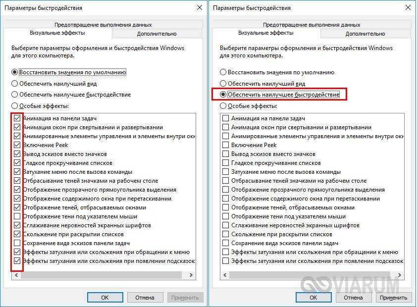 Замечено, что повышенную активность процесса «Системные прерывания» в Windows нередко вызывают визуальные и аудио эффекты. Попробуйте их отключить. Откройте командой systempropertiesperformance параметры быстродействия, отключите часть визуальных эффектов и понаблюдайте за поведением системы. Как вариант, в настройках параметров можно выбрать опцию «Обеспечить наилучшее быстродействие».