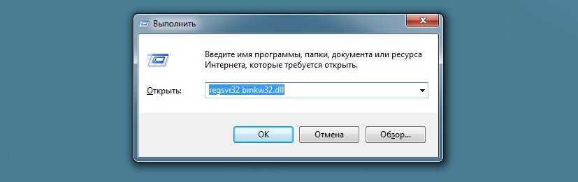 - В открывшемся окне введите команду «regsvr32 binkw32.dll».
