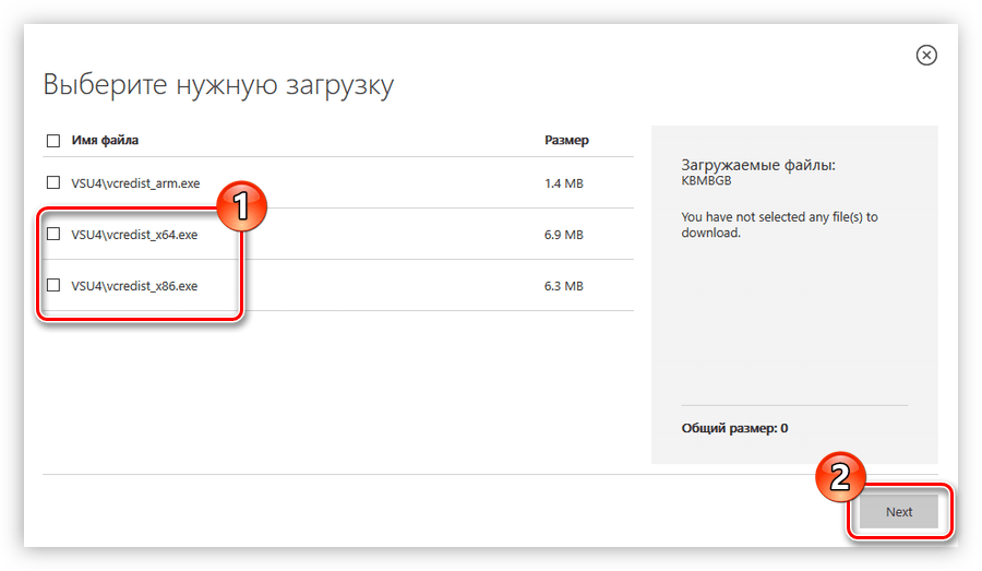 Во всплывающем окне установите галочку рядом с тем файлом, разрядность которого совпадает с вашей системой. Например, для 64-разрядных систем нужно отметить пункт «VSU4vcredist_x64.exe». Далее нажмите кнопку «Next».