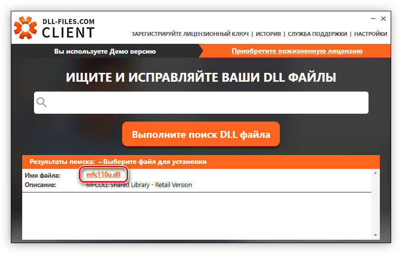 - Запустите программу и выполните поисковой запрос с названием DLL-файла, то есть «mfc110u.dll».