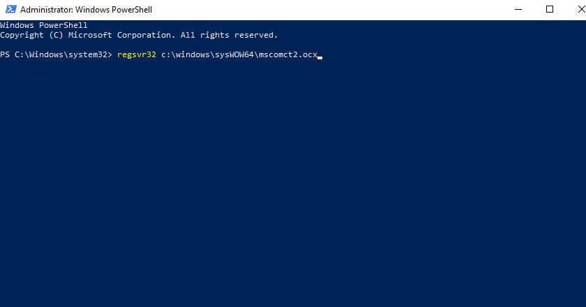 After selecting The PowerShell option, next, you have to enter the mentioned command: regsvr32 c:\windows\sysWOW64\mscomct2.ocx