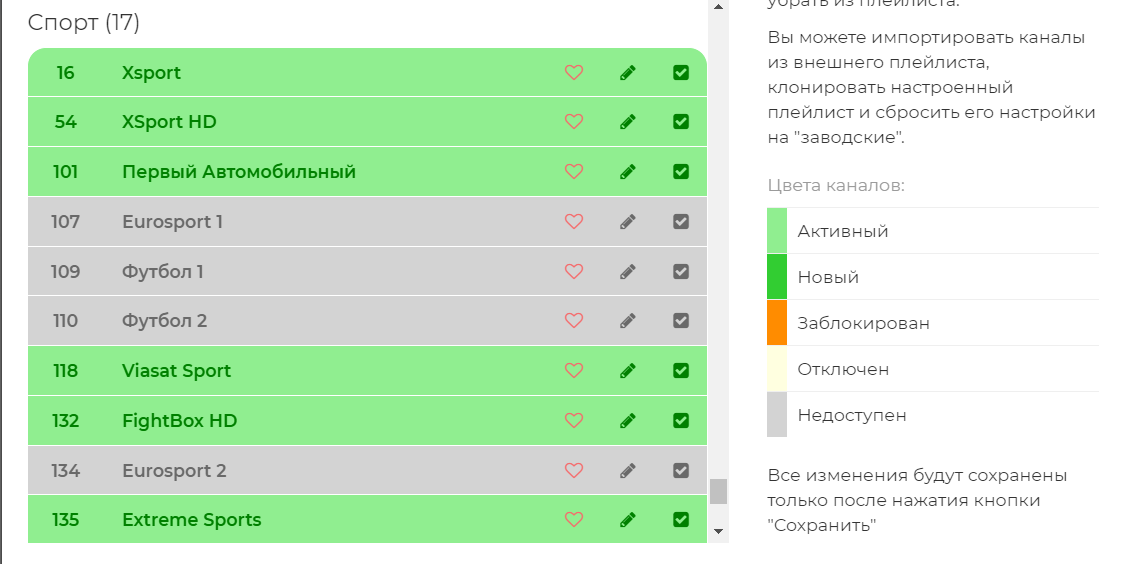 - большое количество каналов в плейлисте, среди которых трудно ориентироваться – проблема решается очень просто – достаточно кликнуть по «сердечку» рядом с названием канала и он автоматически переходит во вкладку «Любимые каналы». Так можно всего за несколько минут отобрать те каналы, которые вам действительно интересно смотреть.