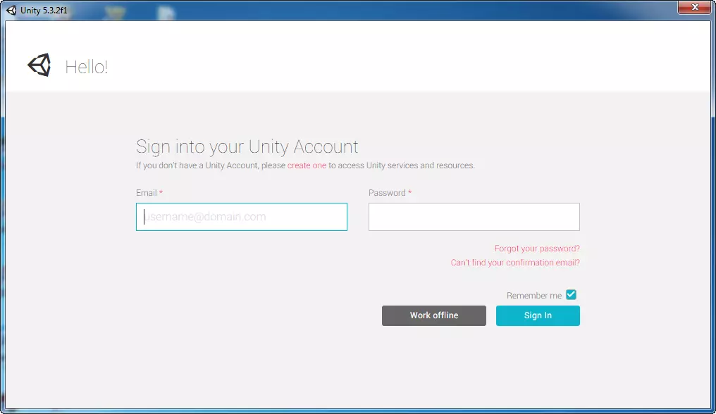 Итак пробуем, первым делом запускается окно с вводом логина и пароля, если у вас есть учетная запись созданная на сайте Unity можете смело вводить свои данные, если нет, можете зарегистрироваться или работать offline, нажав на кнопку work offline.