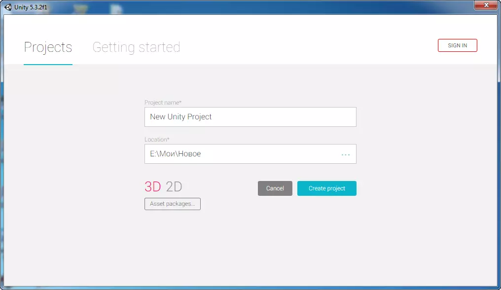 Далее окно выбора проекта, как токовых проектов у вас еще не создано, его необходимо создать, нажав на кнопку NEW. Вводим название проекта и место его расположения, так же выбрать 3D или 2D (по умолчанию стоит 3D) и нажать Create project. Созданный вами новый проект появится в окне Project, для его запуска достаточно нажать на него и у вас запустится Unity.