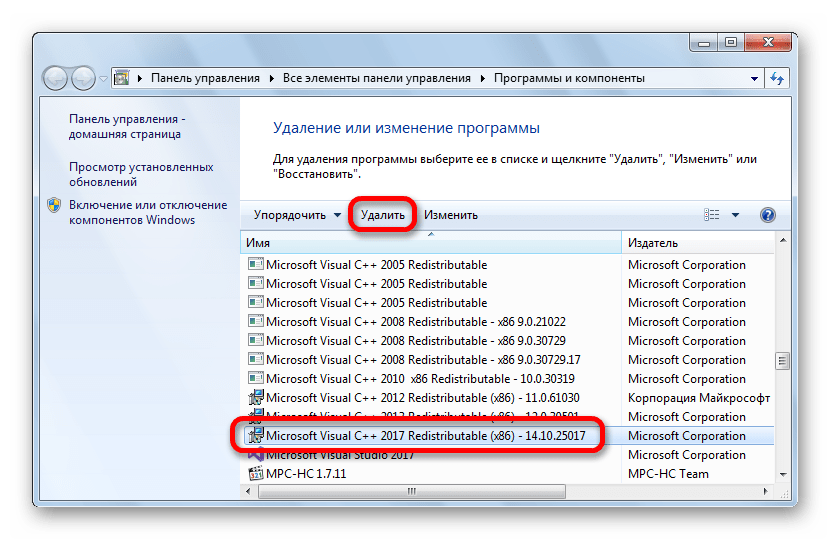 - Находим строку с MS Visual C++ и выбираем опцию в меню «Удалить».