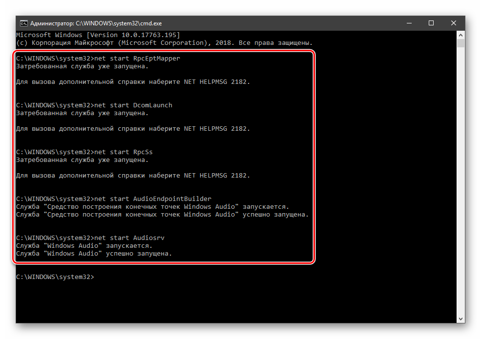 В КС поочередно вводить команды, нажимая клавишу «Enter»: «net start RpcEptMapper», затем «net start DcomLaunch», после «net start RpcSs» и «net start AudioEndpointBuilder», последним «net start Audiosrv».