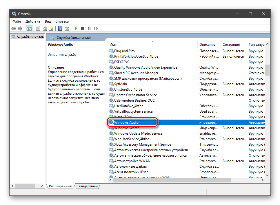 - Ручное включение службы аудио, о чем далее подробнее.
