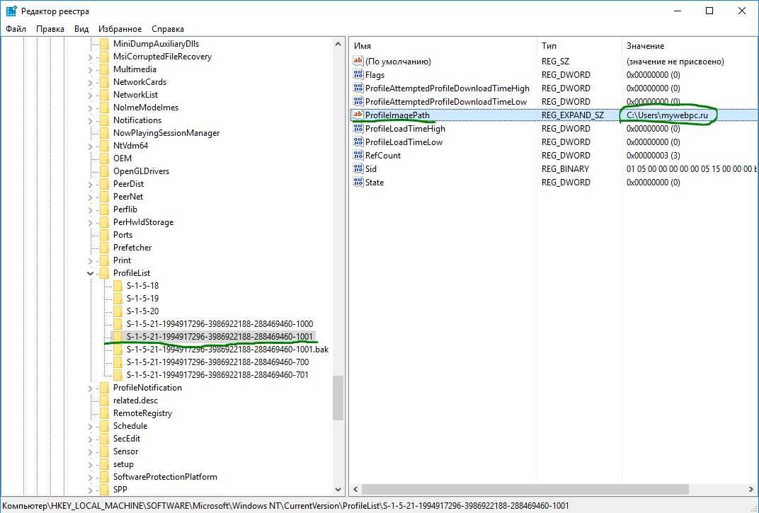 - Перейти: «HKEY_LOCAL_MACHINESOFTWAREMicrosoftWindows NTCurrentVersionProfileList».