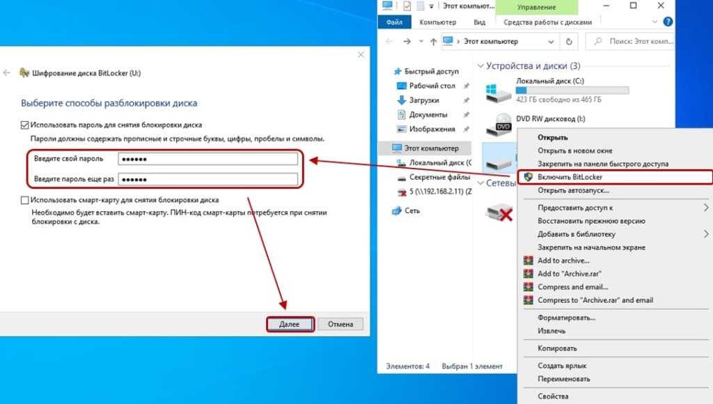 Теперь, когда виртуальный диск создан, необходимо поместить в него целевую папку. После чего правым нажатием мыши вызываем контекстное меню и выбираем в нём «Включить BitLocker». В появившемся окне задаём необходимые параметры и получаем «сейф» для данных в виде виртуального диска с паролем. Таким образом мы ставим пароль не на папку, а на целую группу документов, файлов и папок. Что, согласитесь, достаточно удобно.