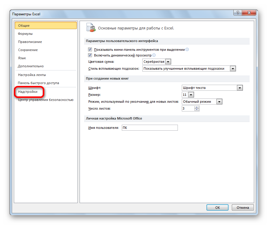 В активном окне параметров переходим в раздел «Надстройки».