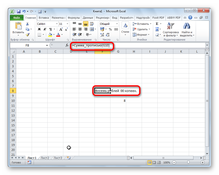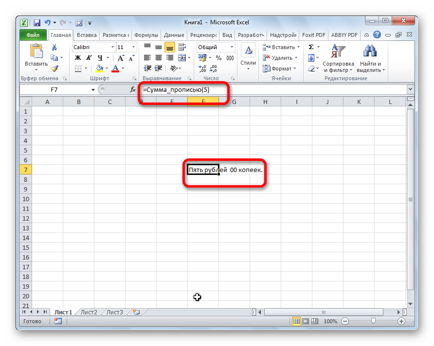 После нажатия клавиши Enter мы также получаем результат в виде суммы прописью в ячейке с формулой.