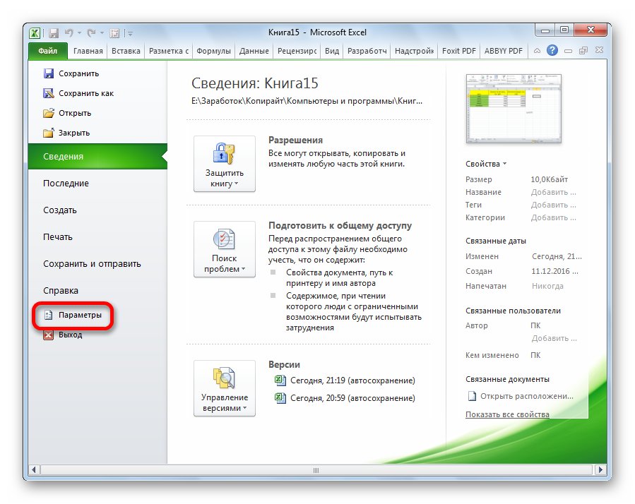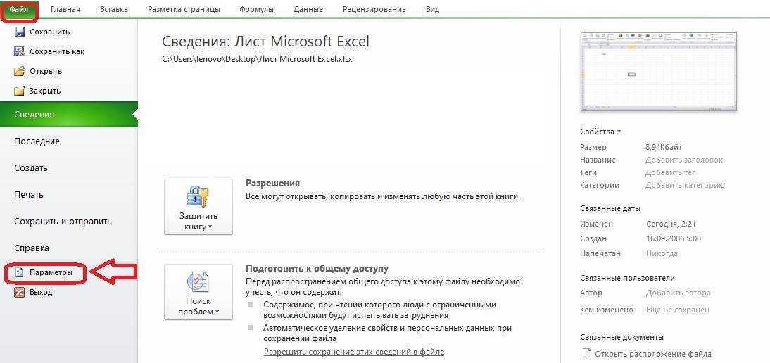 - Необходимо открыть вкладку «Файл» в документе Эксель и выбрать раздел «Параметры». Обычно он находится в нижней части списка разделов.