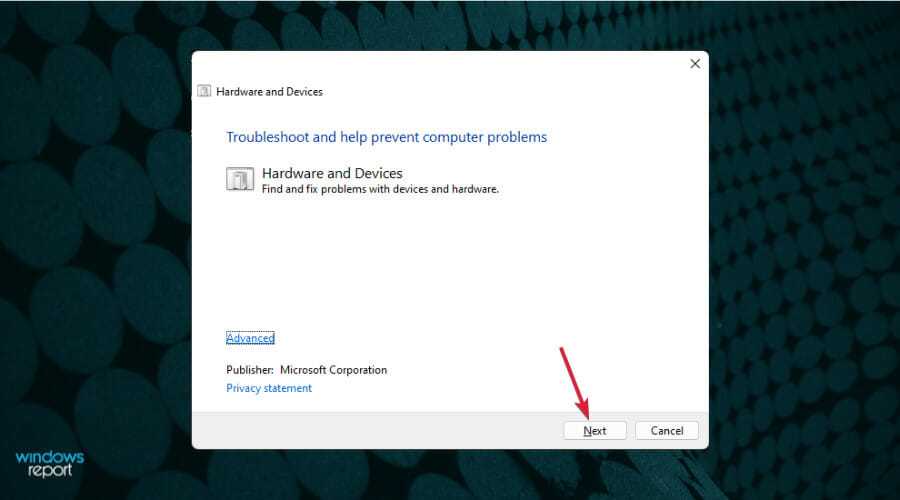Это запустит средство устранения неполадок оборудования и устройств, поэтому нажмите Далее .