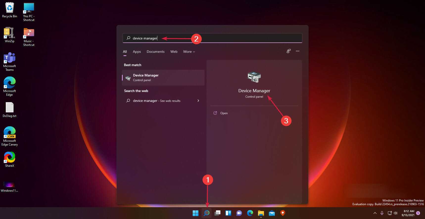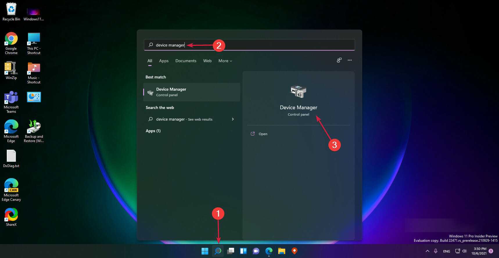 Щелкните значок поиска на панели задач, введите диспетчер устройств и щелкните приложение в результатах.