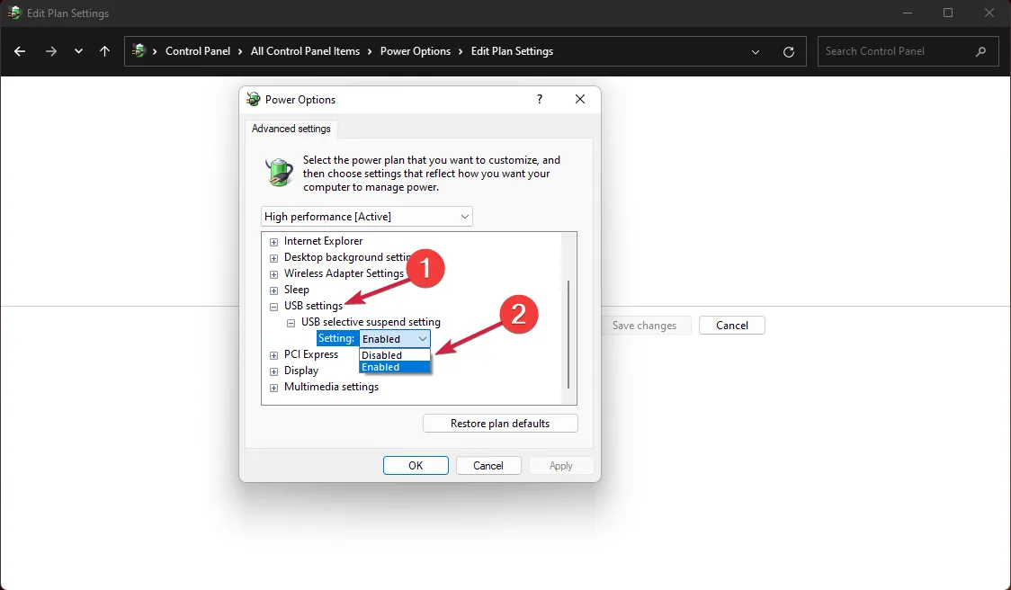 Затем нажмите на настройки USB , расширьте настройки выборочной приостановки USB и измените его значение на Отключено .