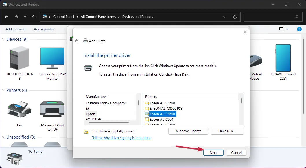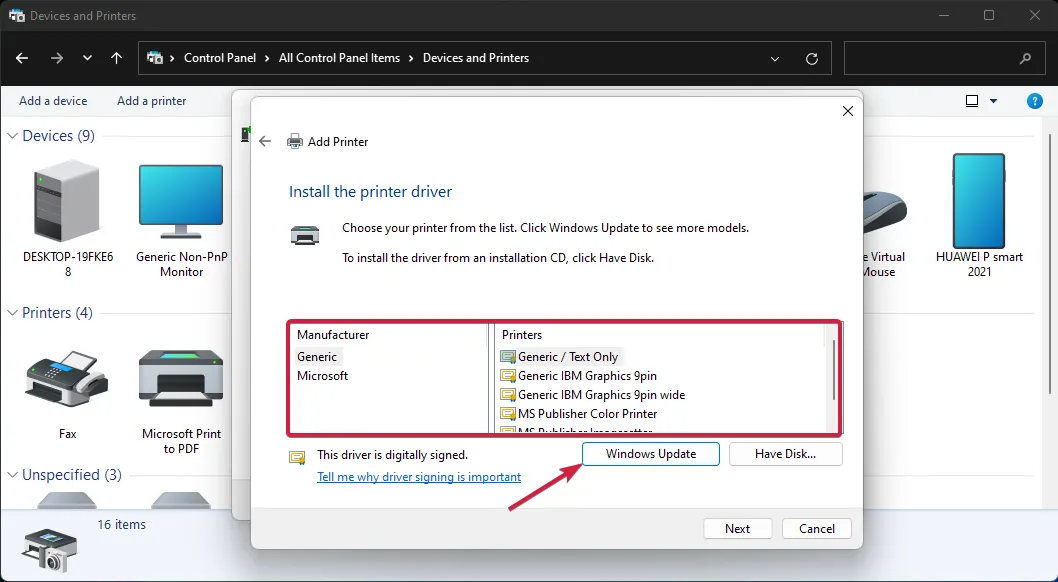 Теперь выберите марку и модель принтера. Если вы не можете его найти, нажмите кнопку « Центр обновления Windows» . Система обновит список.