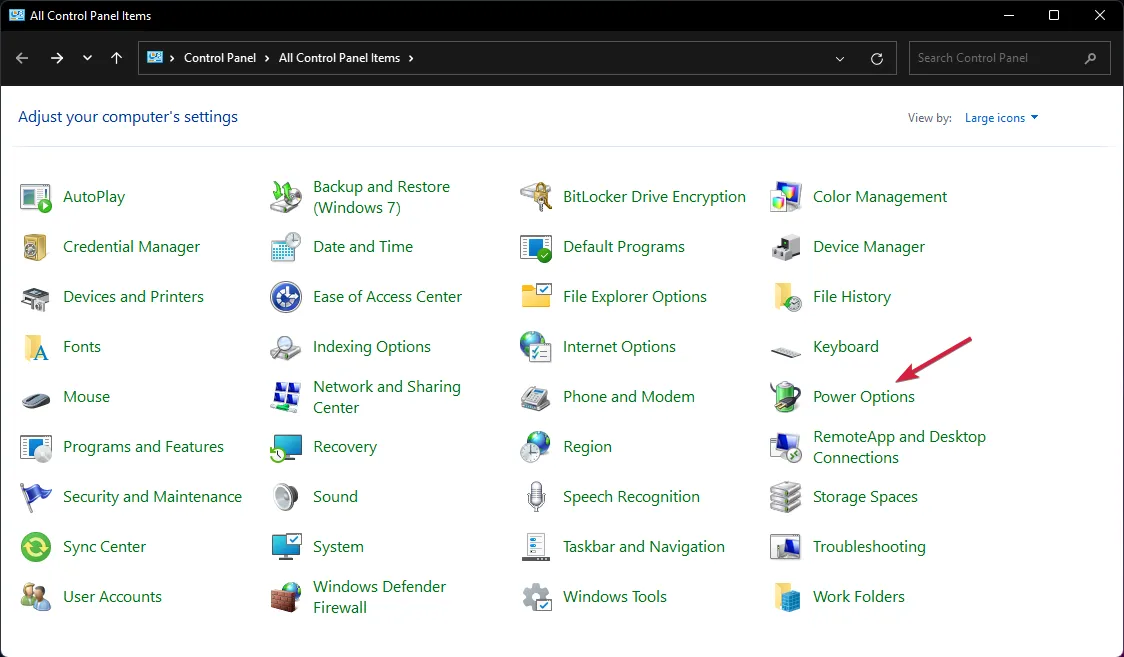 - Переключите на мелкие значки, выберите «Электропитание».