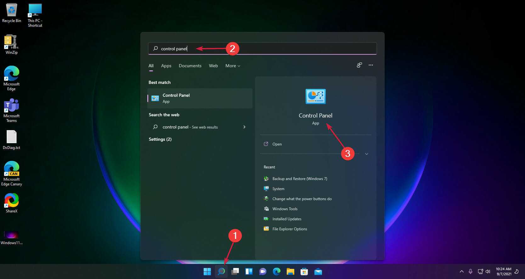Выберите значок поиска на панели задач, введите панель управления и откройте приложение из результатов.
