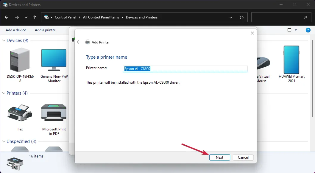 Введите имя принтера или оставьте имя по умолчанию и нажмите Далее .