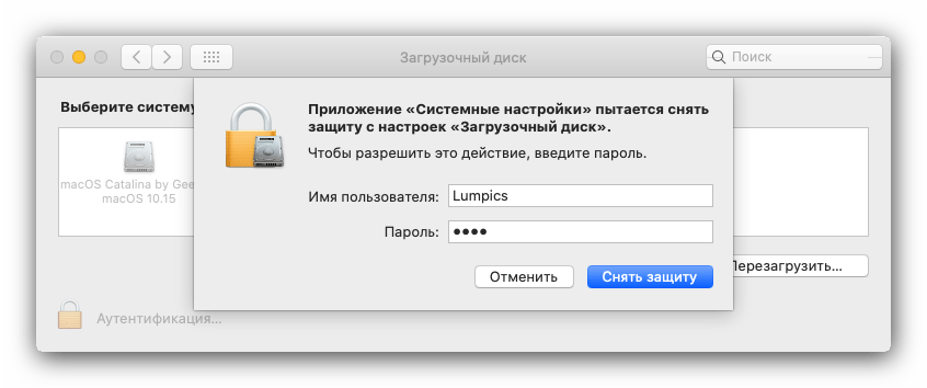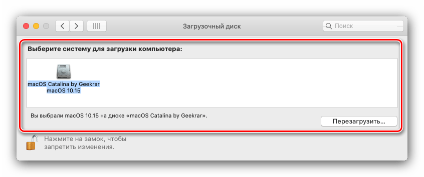 Откроется менеджер накопителей, с которых ваш Мак может загрузиться. Для внесения изменений понадобится кликнуть по кнопке с замком внизу слева.