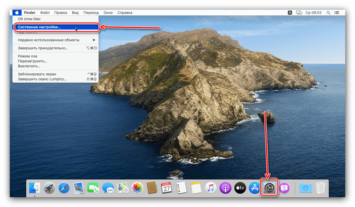 - Подключите вашу флешку к Маку, затем откройте «Системные настройки» любым удобным методом – можно с панели Dock или через меню Apple.