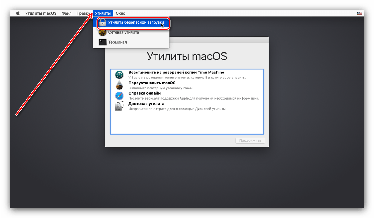 - Появится окно со средством восстановления. Воспользуйтесь панелью инструментов: выберите в ней подменю «Утилиты», а затем пункт «Утилита безопасной загрузки».