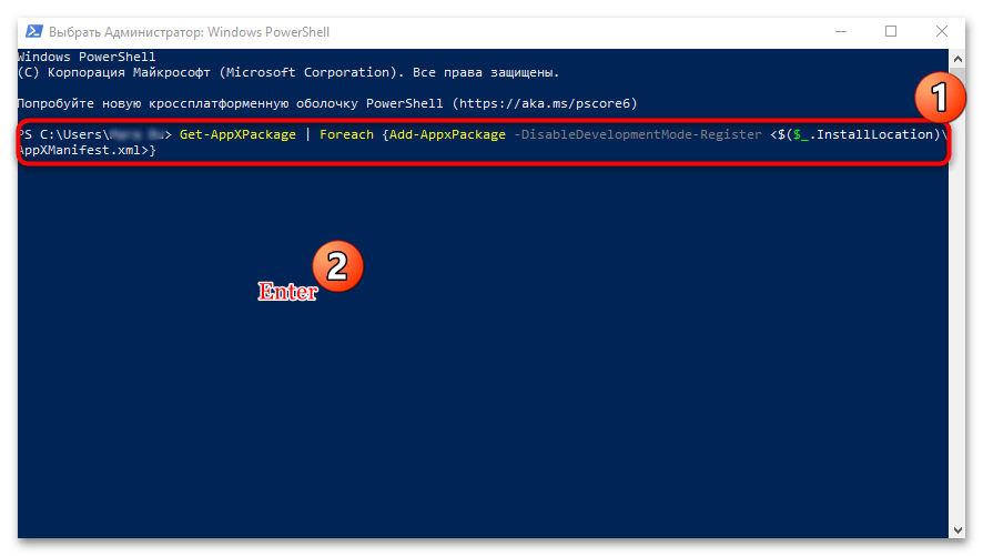 Если встроенное приложение Microsoft Store начало работать некорректно, может появиться ошибка, связанная с игровым режимом. Штатное средство Windows позволит восстановить целостность компонентов магазина путем перерегистрации базовых приложений. Для этого можно воспользоваться «Windows PowerShell»: