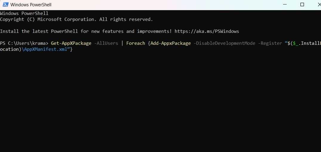 - Введите следующую команду и нажмите Войти : Get-AppXPackage -AllUsers | Foreach