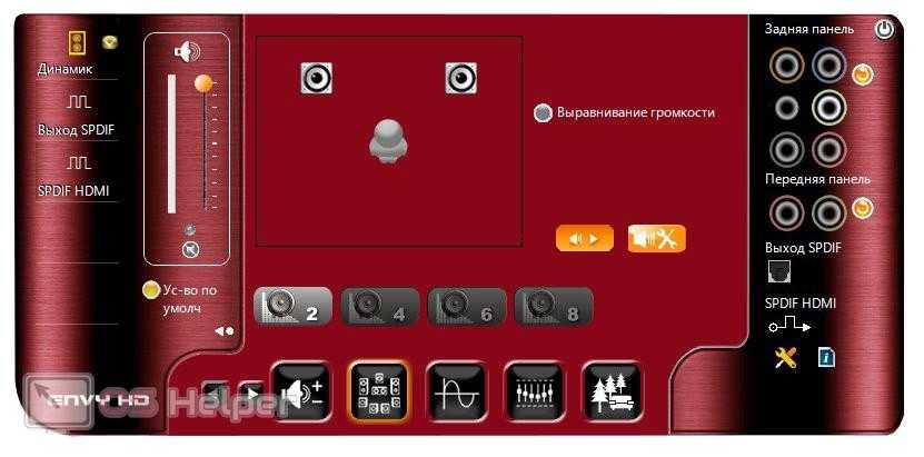 В основном окне программы есть многофункциональное меню. Вы переходите к опциям и выставляйте «рычаги» громкости, настраиваете эквалайзер и настройки громкоговорителей. При необходимости можно указать объемный звук и посмотреть технические данные о звуковой карте.