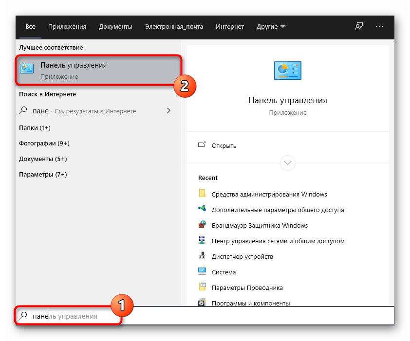 - Откройте «Пуск», через поиск отыщите приложение «Панель управления» и запустите его.