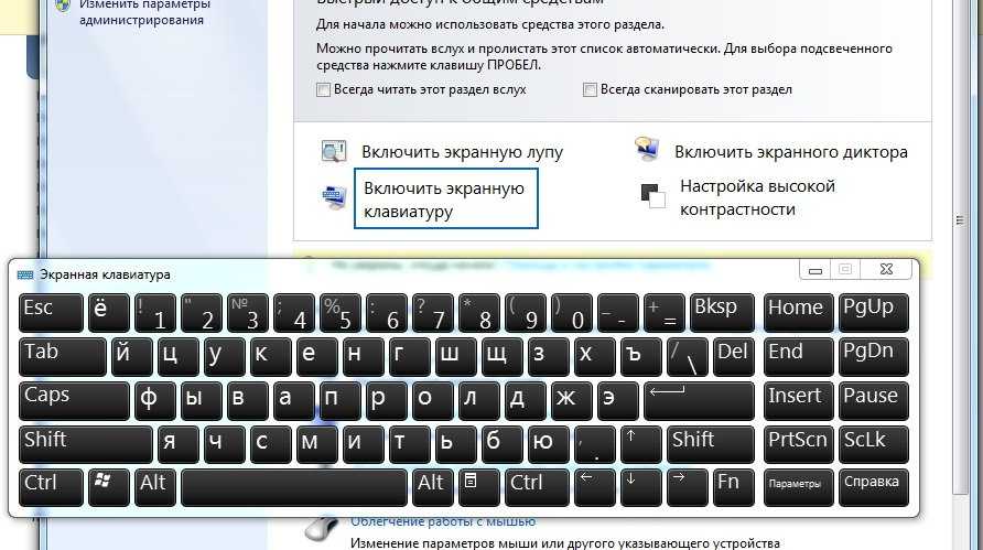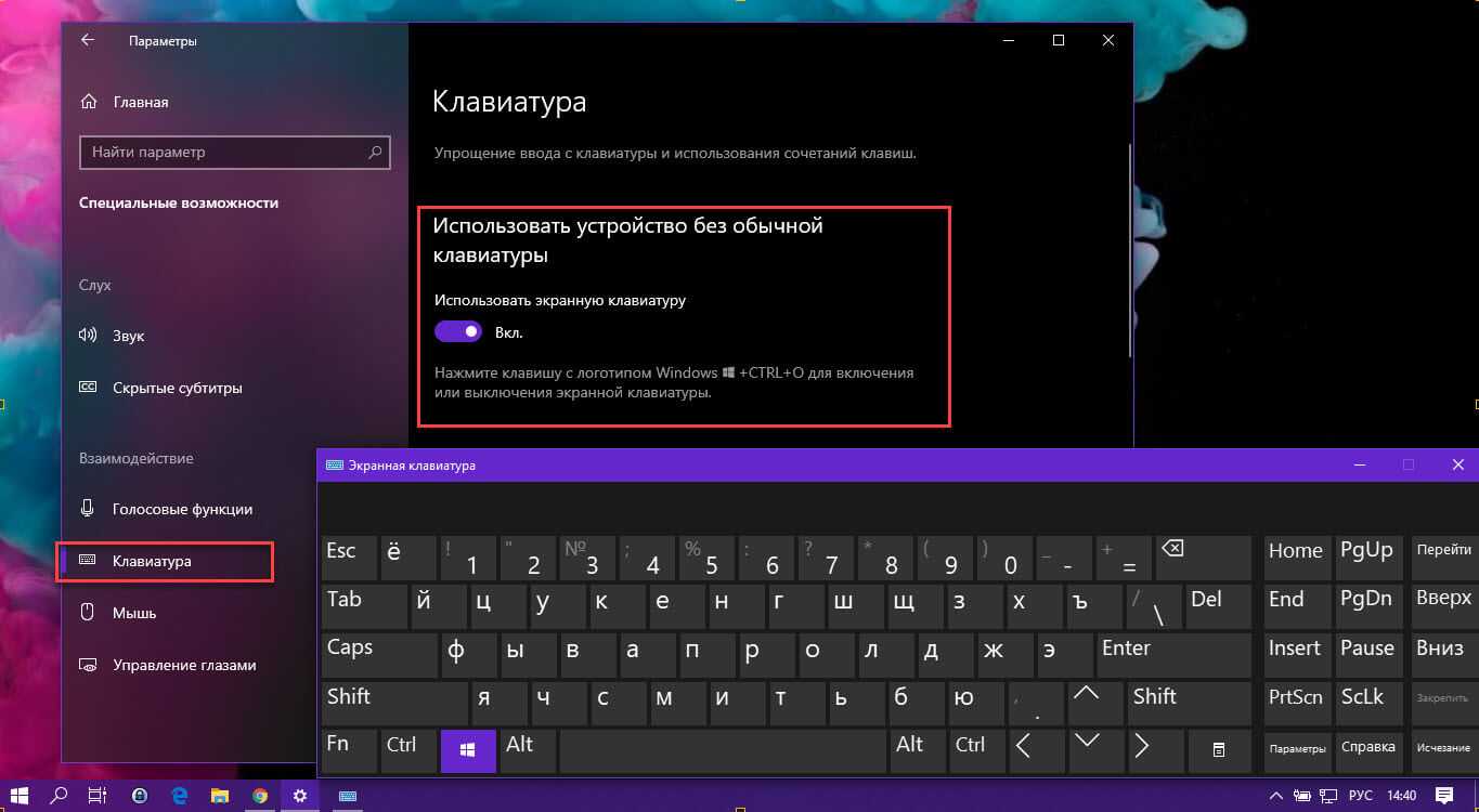 Опция работает следующим образом: при включении на экране появляется окно, полностью копирующее раскладку обычной клавиатуры. Размер окошка, а также другие настройки, меняется в «Параметрах». В меню доступны режимы автоматического запуска, озвучки переключения раскладки, звуковое сопровождение и так далее.