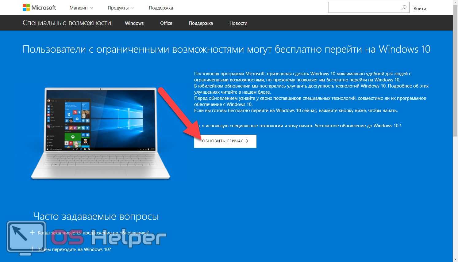 - Посетите сайт https://www.microsoft.com/ru-ru/accessibility/windows10upgrade. Нажмите кнопку «Обновить сейчас».