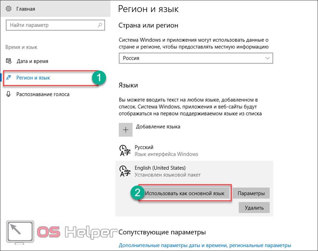 - Далее перейдите в подраздел «Регион и язык» (1). Здесь выберите English (United States) и нажмите «Использовать как основной язык» (2);
