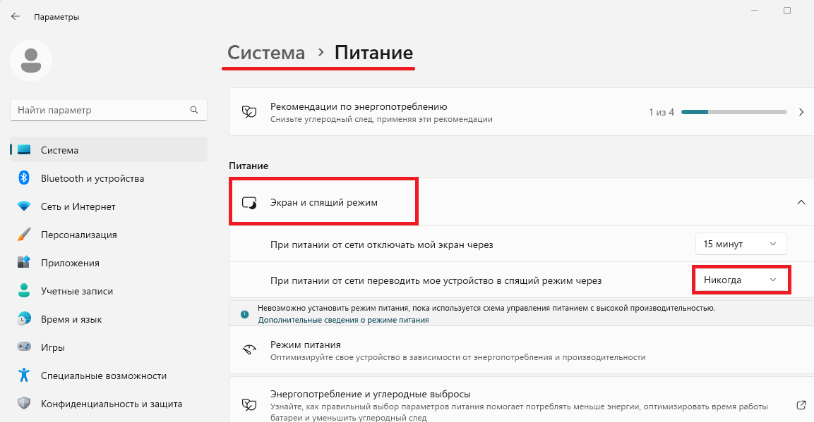 Далее нужно перейти в раздел «Система» и выбрать подраздел «Питание». Нажимаем пункт «Экран и спящий режим» и указываем нужные параметры.