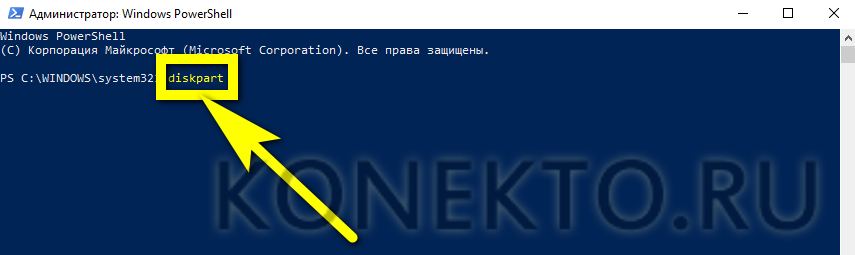 Ввести в окне первую команду diskpart и применить её, нажав на клавишу Enter.