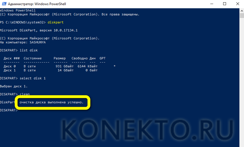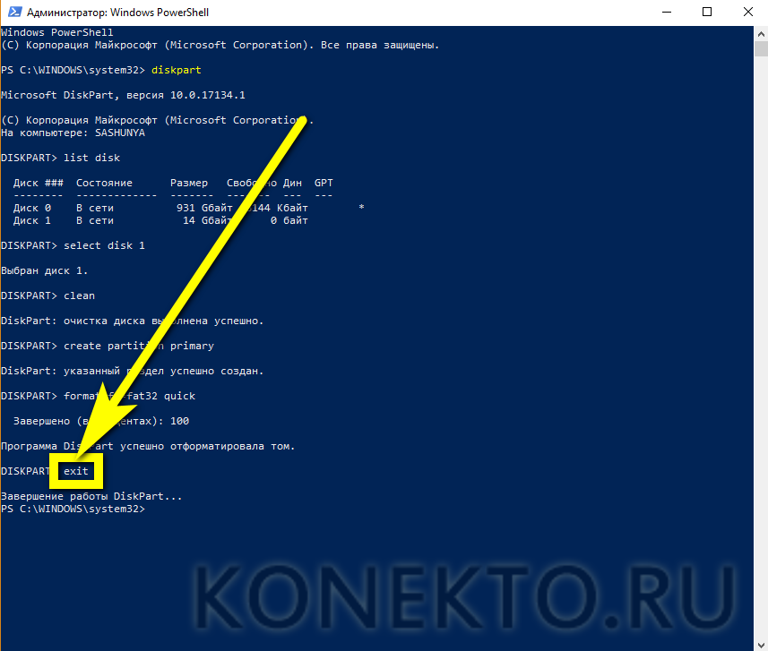 Когда карта памяти будет успешно затёрта, пользователь может просто закрыть окошко Windows PowerShell или командной строки или использовать для завершения работы команду exit.