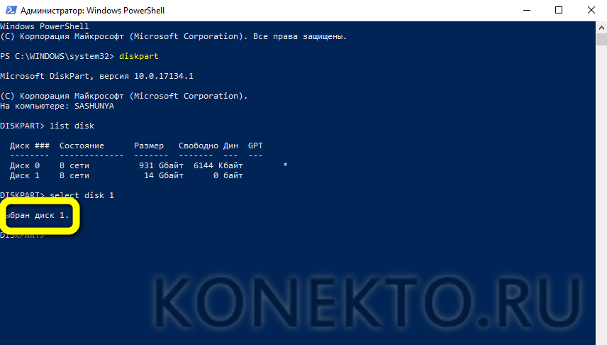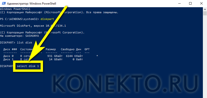 При этом войдите в список disk и нажмите Enter. Вы увидите список дисков и сможете определить съемный диск по его размеру. Введите выберите диск X, чтобы внести изменения в нужное устройство.